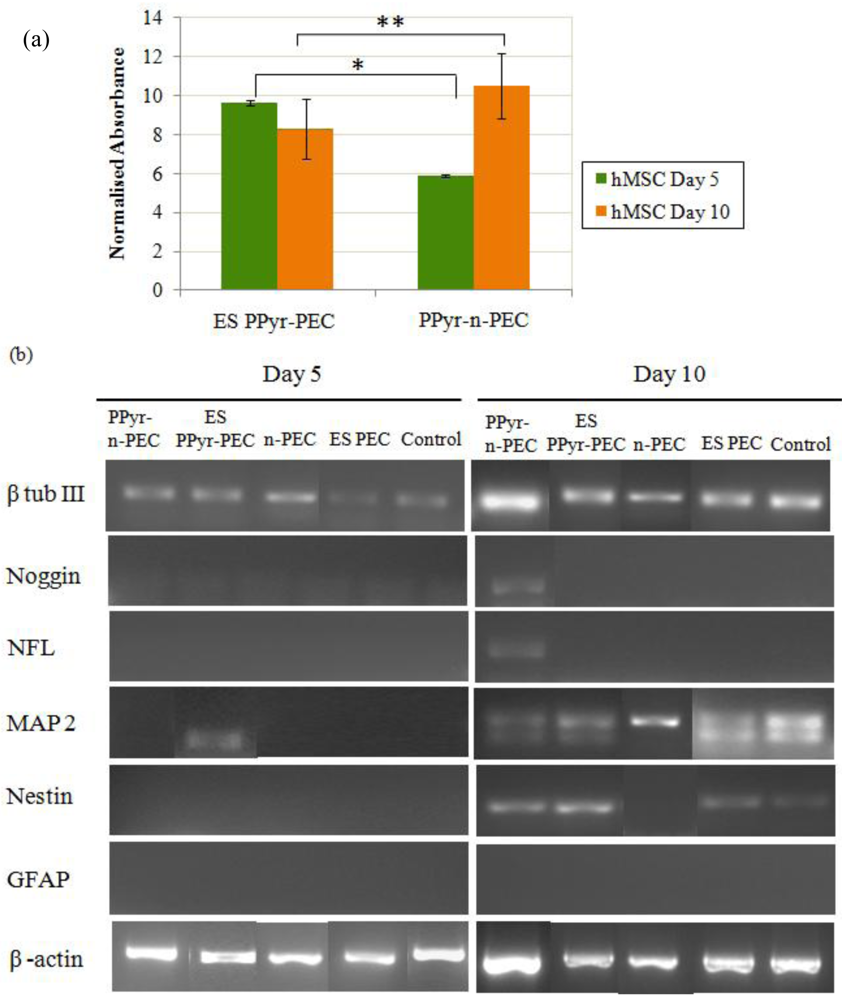 Figure 3. (a) hMSC viability and proliferation results at day 5 and day 10. Statistical significance: * p < 0.0001 (between ES PPy-PEC and PPy-n-PEC samples at day 5), ** p < 0.005 (between ES PPy-PEC and PPy-n-PEC samples at day 10) (b) mRNA expressions of hMSCs at day 5 and day 10. Control refers to hMSCs seeded on glass coverslips.