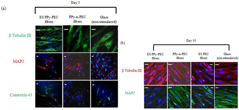 Figure 4. (a) Immunofluorescent staining of β tubulin III, MAP 2 and connexin 43 in hMSCs cultured on ES PPy-PEC, PPy-n-PEC and on control samples at day 5. (b) Immunofluorescent staining of β tubulin III and MAP 2 in hMSCs cultured on ES PPy-PEC, PPy-n-PEC, ES PEC and control samples at day 10. Scale bar = 20 μm. The cell nuclei in all panels were stained with DAPI and shown in blue.