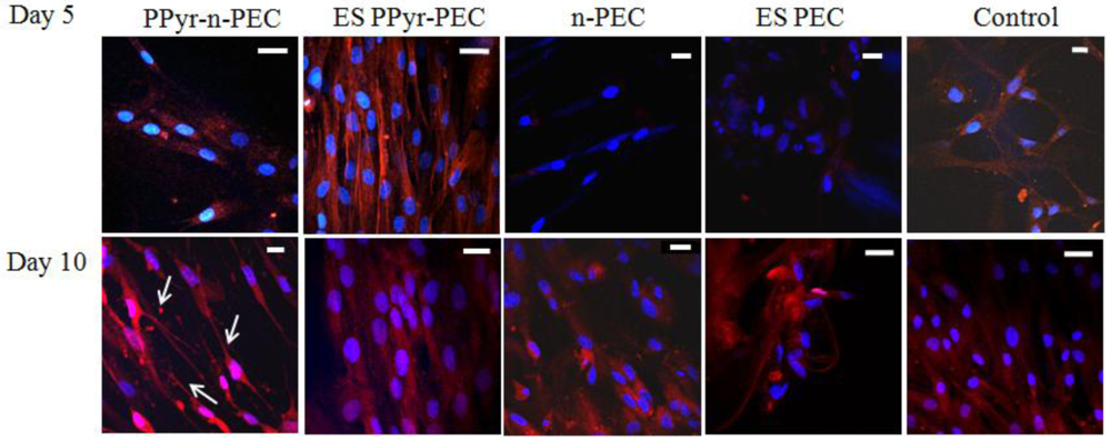 At day 10, the filament-like organization of synaptophysin in ES PPy-PEC samples was not as evident as in day 5 while the hMSCs in PPy-n-PEC samples showed synaptophysin upregulation and the cells adopted neuronal-like morphology, as indicated by the arrows in Figure 5. hMSCs in n-PEC, ES PEC and control samples expressed synaptophysin but did not adopt neuronal-like morphology.