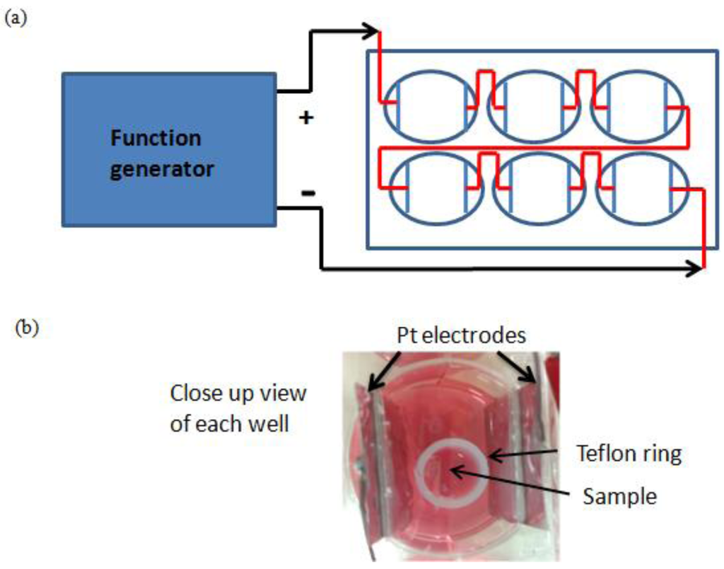 Figure 6. (a) Setup of hMSC electrical stimulation device. A 6-well culture plate cover was modified so Pt strips could be slotted through the cover plate and fixed to deliver electrical pulses into each of the cell wells. The 6-well culture plate was connected to the function generator and stimulated in the cell culture incubator. (b) Close-up image of each well. The fiber sample, secured by a Teflon ring to the well, was placed between the Pt electrodes.