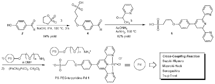 The amphiphilic PS-PEG resin-bound terpyridine ligand was prepared from p-hydroxybenzaldehyde (2), propane sultone (3), 2-acetylpyridine (5), and PS-PEG-NH2 resin, and the coordination of the synthesized polymeric terpyridine ligand with palladium species proceeded to give the PS-PEG resin-supported terpyridine palladium complex 1, which exhibited good catalytic activity for the cross-coupling reaction. Thus, the reaction of p-hydroxybenzaldehyde (2) with propane sultone (3) in isopropyl alcohol (IPA) at 100 °C for 3 h under alkaline conditions followed by treatment of the obtained 3-(4-formylphenoxy)propane-1-sulfonic acid (4) with 2-acetylpyridine (5) and AcONH4 in acetamide at 150 °C for 5 h gave terpyridine ligand 6 in a 68% yield in two steps. Immobilization of terpyridine ligand 6 onto an amphiphilic PS-PEG resin through ionic bonds to the sulfonate group was performed in DMF at room temperature for 1 h and the complexation of an amphiphilic PS-PEG resin-bound terpyridine ligand and Pd(II) occurred in CH2Cl2 to give PS-PEG-terpyridine-Pd(II) complex 1 as a brown solid [23-26].