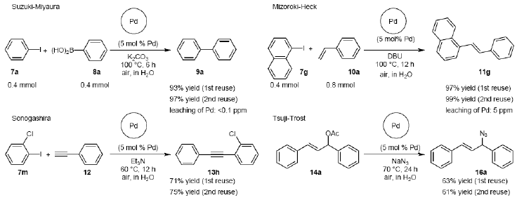 Palladium-catalyzed reactions that form carbon-carbon bonds, such as Suzuki-Miyaura, Mizoroki-Heck, Sonogashira, and Tsuji-Trost cross-coupling, are of considerable importance in organic chemistry [1-11]. These cross-coupling reactions are generally catalyzed with soluble palladium complexes in an organic solvent or in a mixture of water and an organic solvent [12-15]. However, there has been a continuing challenge with such catalyst systems regarding their efficient separation and recycling, which are important considerations for economic and ecological reasons.