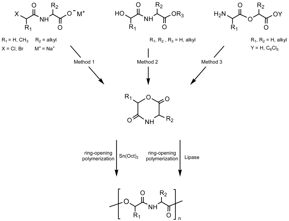 Enzymes such as lipases were another type of efficient catalyst [20-22] for polymerizations that, in this case, proceeded through ring-opening at the ester bond. Thus, the polymerization behavior was strongly influenced by the configuration of the hydroxyl acid moiety but not by the configuration of the α-amino acid moiety since steric effect of hydroxyl acid side chains decreased the activity of the cyclic monomer. In general, enzymatic polymerization gave rise to an enhanced racemization (mainly at the amino acid residue) than more conventional Sn(Oct)2-catalyzed polymerizations.
