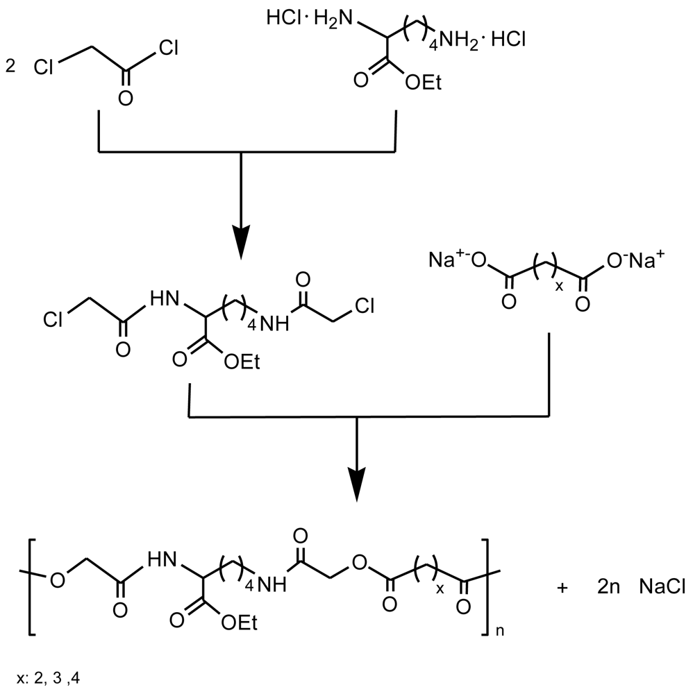 Besides aliphatic polyesters, various types of functionalized synthetic polymers have been designed, tested and, in some cases, commercialized for biomedical applications, although in general are still in a premature stage. Poly(ester amide)s (PEAs) constitute a promising family of biodegradable materials since they combine a degradable character, afforded by hydrolizable ester groups (–COO–) placed in the backbone, with relatively good thermal and mechanical properties given by the strong intermolecular hydrogen bonding interactions that can be established between their amide groups (–NHCO–). Currently, a considerable variety of PEAs have been studied including the use of different monomers (e.g., α-amino acids, α,ω-aminoalcohols or carbohydrates) or different polymer microstructures (e.g., ordered, blocky or random monomer distributions) [6,7]. The presence of hydrolytically cleavable ester bonds in the backbone and the lowering of the crystallinity make also poly(ester amide)s promising materials for their use in medical fields. Note also that the incorporation of α-amino acid moieties may lead to biocompatible materials and, depending on their side groups, to functionalized polymers.