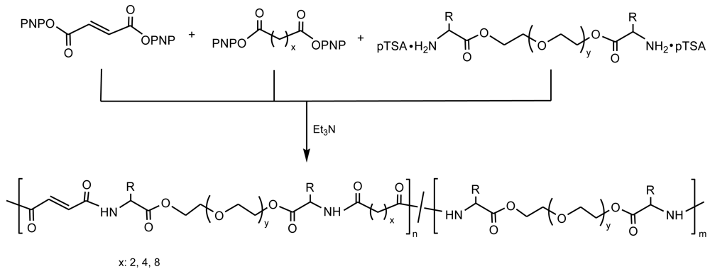 A series of biodegradable random unsaturated/saturated poly(ether ester amide)s were synthesized by solution polycondensation of diamine salts of phenylalanine and triethylene glycol with the p-nitrophenyl active esters of mixtures between unsaturated (fumaric acid) and saturated dicarboxylic acids (succinic, adipic and sebacic acid) (Figure 14) [62]. These random copolymers were obtained with fairly good yields and Mn molecular weights ranging from 3,000 to 27,000 g/mol, and polydispersity indices between 1.52 and 2.13. Copolymers showed a high degradability in α-chymotrypsin enzyme solutions and the biodegradation rates decreased with the unsaturated content. Interestingly, it was concluded that upon adjusting monomers feed ratio, copolymers could have controlled chemical, physical, and biodegradation properties.