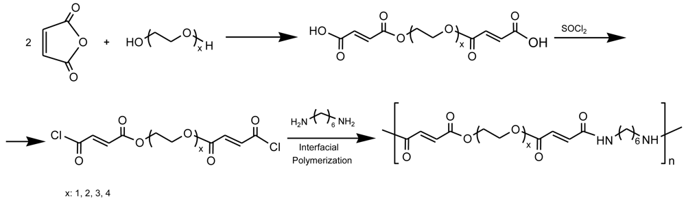 A series of biodegradable unsaturated PEAs containing also ethylene glycol moieties (from 1 to 4 units) was successfully prepared through interfacial polycondensation of 1,6-hexanediamine and the unsaturated diacylchloride derived from a previous reaction of maleic anhydride with oligo(ethylene glycol) (Figure 16) [70]. The obtained poly(ether ester amide)s were amorphous, and stable up to 300 °C under nitrogen, showed good hydrophilicity and improved solubility. Polymers were hydrolyzable in a rapid and steady way, increasing the rate of hydrolytic degradation by increasing the number of ether linkages per repeat unit.