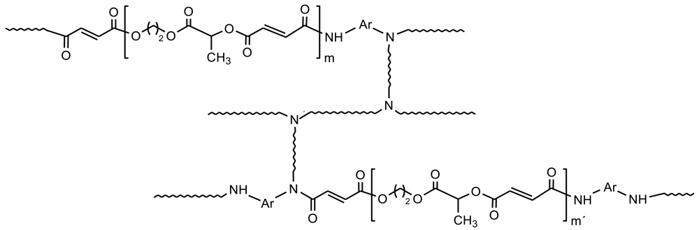 An unsaturated dicarboxylic-terminated oligoester was prepared by reaction of ethylene glycol lactate diol with maleic anhydride [71]. The oligoester was then melt-polycondensed with toluene-2,4-diisocyanate to render a crosslinked resin with unsaturated double bonds (Figure 17). The new polymer showed a porous structure due to the formation of CO2 in the last synthesis step and was degradable. As a result of introducing isolated C=C double bonds, the polymer was flexible enough to exhibit shape-memory characteristics. It is worth mentioning that the glass transition temperature was close to human body temperature which meets one of the basic requirements for medical applications.