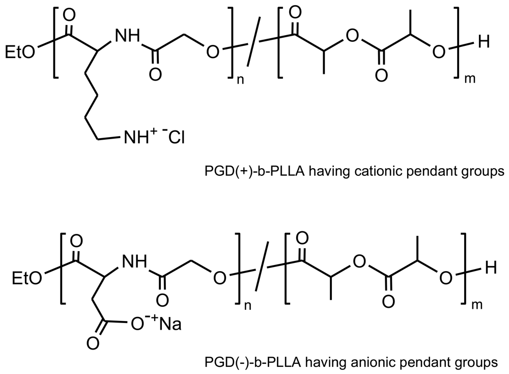 Barrera et al. synthesised a copolymer of L-lactic acid and L-lysine containing about 2 mol% of L-lysine residues [39,47]. Further reaction of pendant lysine with Nε-(benzyloxycarbonyl)-L-lysine-N-carboxyanhydride provided up to a 35-fold increase in the lysine residue [48].
