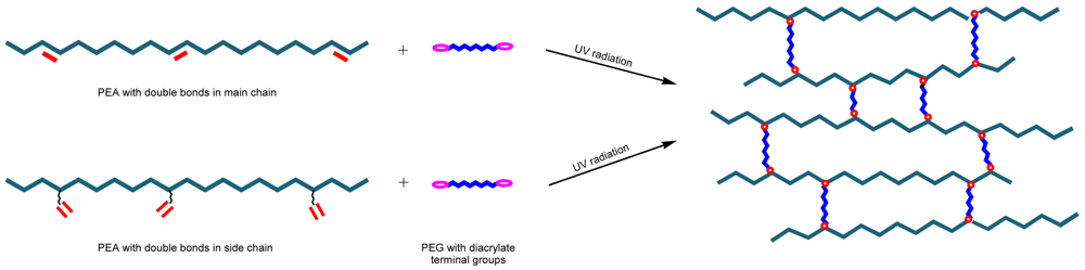 Hydrogels are of great interest for their use as medical implants, biosensors, bioseparators, and matrices for drug delivery and tissue engineering since they have high water content like body tissues and may be highly biocompatible. Biodegradable hydrogels are of interest as drug delivery systems for two main reasons: (a) A permanent foreign-body reaction is not produced after the materials serve their intended functions due to their biodegradability; and (b) biodegradable hydrogels could provide a drug release mechanism different to a traditional diffusion-based controlled release. The biodegradation-based mechanism is critical for complete release of large molecular weight drugs, especially pharmaceutically active proteins and peptides [96]. Hydrogels can be prepared by photocrosslinking PEAs with unsaturation on their main chain or in the side chain (Figure 24).