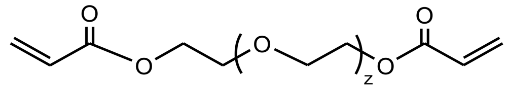 Hydrogels derived from copoly(ester amide)s with chemical structures displayed in Figure 15 (i.e., having carbon-carbon double bonds in their main chain) were prepared by photocrosslinking with poly(ethylene glycol) diacrylate (Figure 25). In fact, poly(ethylene glycol) is one of the frequently used hydrogel precursors since in vivo use is approved by the U.S. Food Drug Administration. Furthermore, elastic modulus, hydrophilicity and swelling behavior of these kind of hydrogels can be improved since the hydrophobic character of initial copoly(ester amide)s is balanced [97,98]. Based on the weight loss data, α-chymotrypsin had a much more profound effect on the hydrolysis (up to 32% weight loss on day 31) than PBS (less than 16%). The changes in elastic moduli and the interior morphology of the hydrogels were monitored during biodegradation and both the crosslinking density and the molecular weight between crosslinks determined. The differences in biodegradation rates showed that hydrogels could have controllable biodegradability by changing the concentration of α -chymotrypsin, the type of unsaturated precursor and the feed ratio (i.e., the ratio between the PEA precursor and the acrylate coupler).