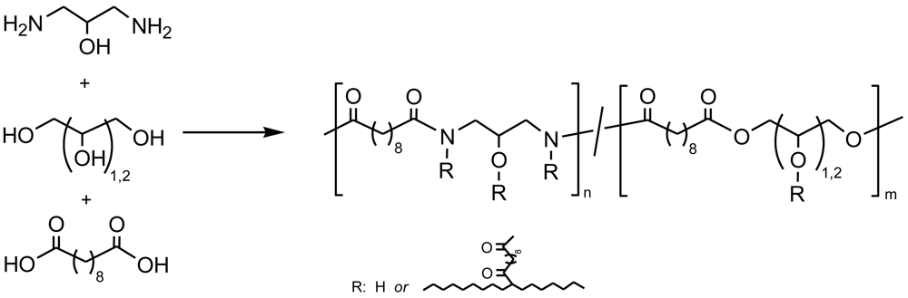 New biodegradable elastomeric PEAs have also been synthesized for tissue engineering applications [102]. These new materials allow overcoming some limitations of conventional crosslinked aliphatic polyesters: (a) High crosslink densities, which result in exceedingly high stiffness; (b) rapid degradation upon implantation; or (c) limited chemical moieties for chemical modification. Poly(1,3-diamino-2-hydroxypropane-co-polyol sebacate)s formed crosslinked networks through the hydroxyl group and polyol (glycerol and/or D,L-threitol) units (Figure 26), and featured tensile Young's modulus on the order of 1 MPa and reversible elongations up to 92%. These polymers exhibited in vitro and in vivo biocompatibility and had projected degradation half-lives of up to 20 months in vivo.