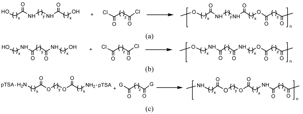 Polycondensations are usually applied to react diamide-diol, diester-diamine, ester-diamine or diamide-diester monomers with dicarboxylic acid derivatives or diols, as shown in Figure 2. Reaction of α,ω-aminoalcohols with acid anhydrides or dicarboxylic acid derivatives is another typical way to get PEAs from condensation reactions. It is easy to get functionalized PEAs when monomers incorporate α-amino acid or carbohydrate units, or have at least one unsaturated monomer which could be for example a simple dicarboxylic acid derivative.