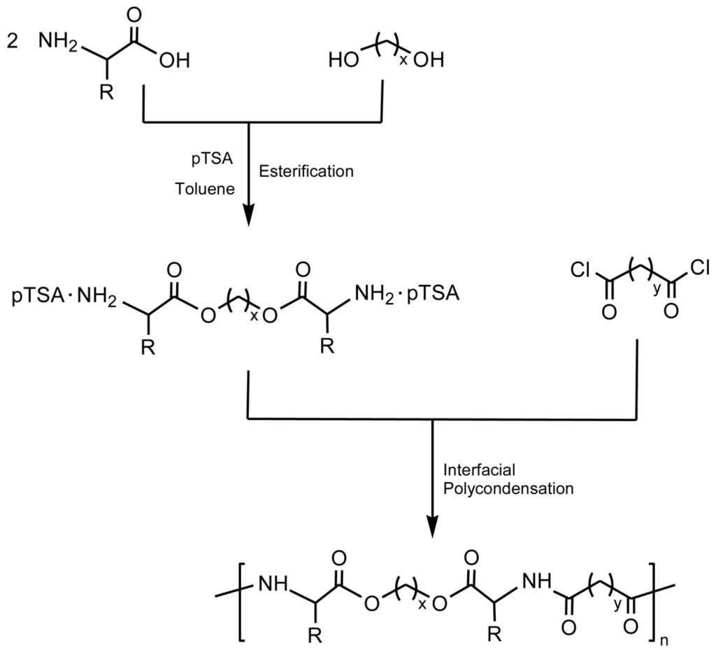 Typically poly(ester amide)s containing α-amino acid units can be, in this case, prepared by reaction of a diacid chloride with a diester-diamine obtained by previous condensation of a diol with two α-amino acid units [27-30]. Since the diester-diamine is unstable as free base and tends to produce undesirable side reactions, the monomer is prepared as a stable salt of di-p-toluenesulfonic acid (Figure 4).