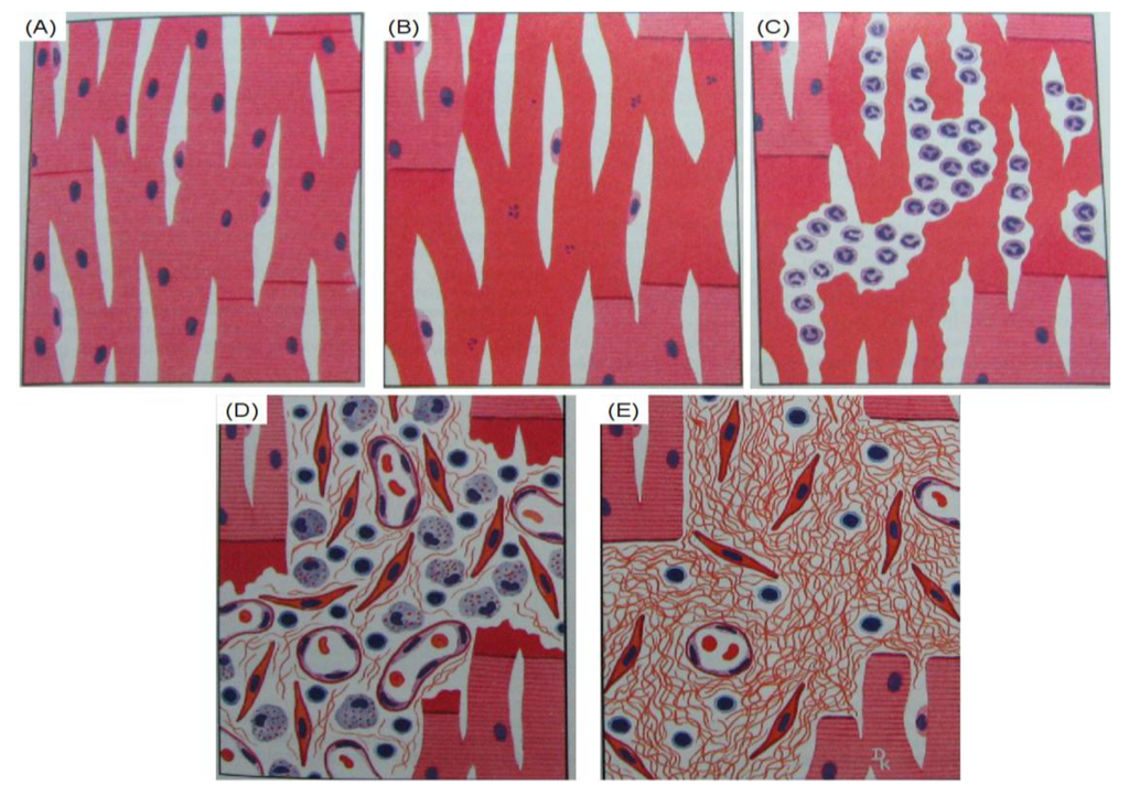 For acute MI, if the blood supply resumes within 30 min, the injured myocardium can revert into normal state, although a depression in contractility may persist for hours (Figure 3(A)). After 30 min, the myocardium undergoes an irreversible necrosis process, beginning with swollen mitochondria, broken nuclei, and disruptions in the cell membrane, and disordered tissue structure. Within 12–18 h, proteins in the cytosol start to leak out and the dead myocardial fibers form “wavy fiber” under the stretching of the systole (Figure 3(B)). Within 2 days, polymorphonuclear leukocytes are attracted to the infarcted area and accumulate in the periphery of the infarcted sites. The neutrophils start to infiltrate until they fill the infarcted area. The phagocytosis of dead cardiomyocytes can then be clearly seen in the infarcted area (Figure 3(C)). At day 5, fibroblasts start to proliferate and collagen deposition begins (Figure 3(D)). After 3 weeks, the inflammation process withdraws and collagen deposition continues. In the fourth week, a dense fibrous scar tissue is formed, and the remodeling of the MI is nearly finished [12] (Figure 3(E)). The gradual maturation of the scar tissue will further induce heart wall dilation to compensate for the lost heart function by accommodating a larger volume of blood.