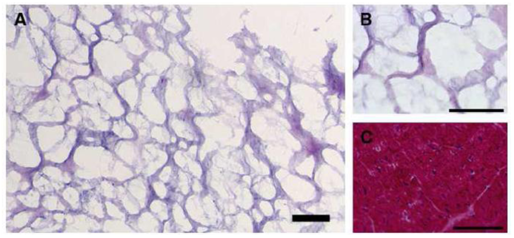 Alternatively, a collagen-containing decellularized matrix can be used. It is prepared by decellularizing native tissues like bladder, pericardium, and heart [17]. Mirsadraee et al. decellularized the pericardium and found that the chemical compositions of the native and acellular pericardium are not significantly different [18,19]. In addition, no cytotoxicity was observed for human dermal fibroblasts seeded on the acellular sample. Further study on foreign body reaction showed that the acellular pericardium provoked minor macrophage response [20]. These results demonstrate the feasibility of using acellular ECM as a potential scaffold for cardiac tissue engineering. Recently, a groundbreaking study by Ott et al. showed that a decellularized rat heart can be used as a template to make a functional heart by recellularizing it with cardiomyocytes, endothelial cells (ECs), and smooth muscle cells (SMCs) [21].