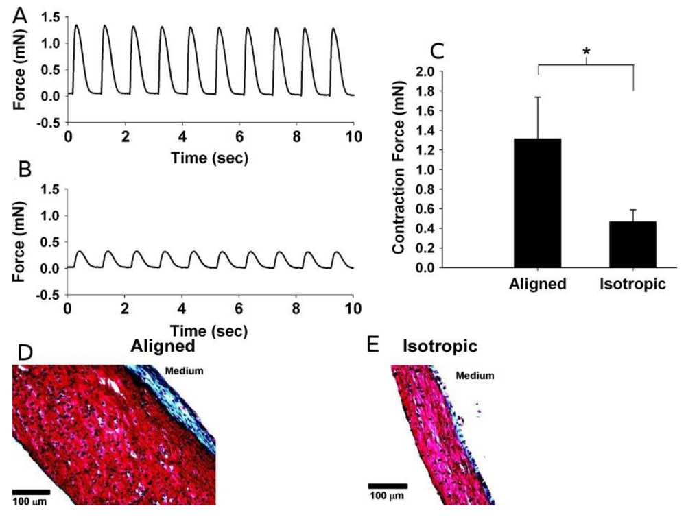 Fibrin is formed during the haemostatic coagulation process by combining fibrinogen and thrombin under the catalysis of calcium ions [23]. Fibrin gel is biodegradable and nontoxic. Therefore, it is suitable for tissue engineering. Birla et al. fabricated hollow fibrin gel tubes populated with neonatal cardiomyocytes and implanted into the femoral artery of adult rats [24]. After 3 weeks of implantation, the fibrin gel/cardiomyocytes construct formed a mature cardiac tissue with a dense capillary network. It possessed all normal cardiac functions, including contractility under electric stimulation and synchronous pacing with an outside electric signal. Huang et al. embedded rat cardiomyocytes within fibrin gel and found that their contractility can be retained up to two months with normal pacing ability [25-27]. The embedded cardiomyocytes showed aligned morphology. Black et al. cultured the fibrin/cardiomyocytes constructs under circumferential/radial contraction condition (“isotropic” group) and circumferential/radial/axial contraction condition (“aligned” group), respectively [28]. Although the “isotropic” group had a high collagen content and cell density, the mechanical contract response under electrical pacing stimulation was significantly less than that in the “aligned” group (Figure 5(A–C)). This difference can be explained by the different contents of connexin 43 (CX43) protein under different conditions.