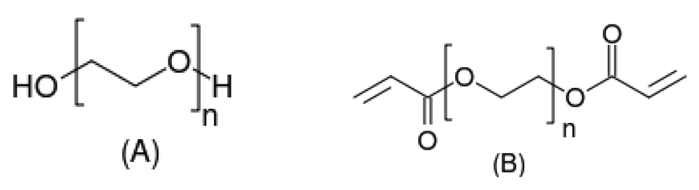 Poly(ethylene glycol) (PEG, Figure 6(A)) is a water soluble polymer synthesized by the ring-opening polymerization of ethylene oxide [36]. It is biocompatible and has been approved by the FDA. PEG hydrogel is typically made by the polymerization of diacrylate-modified PEG (Figure 6(B)) via photo-polymerization under ultraviolet (UV) irradiation. PEG gel has been widely used as a supporting matrix in almost every field of tissue engineering (nerve, cartilage, liver, pancreas, bladder, skin) because its low protein adsorption and inert surface reduce the inflammation after implantation. However, low protein affinity is not beneficial for cell adhesion. Methods like conjugating cell adhesive peptides or proteins and incorporating growth factors are used to increase cell adhesion [6,37]. PEG hydrogel has been used to study cardiomyocyte-matrix interactions in a three-dimensional (3-D) environment. For example, it was found that Arg-Gly-Asp (RGD) peptide modification largely increased the viability of encapsulated cardiomyocytes [38]. Kraehenbuehl et al. constructed a series of PEG hydrogels with different moduli by varying crosslinking density [7]. Embryonic stem cells (ESCs) were encapsulated inside. The results showed that hydrogels with lower moduli (soft) induced the ESCs differentiation into cardiomyocyte lineage. The differentiated cells exhibited a cardiac-like function.