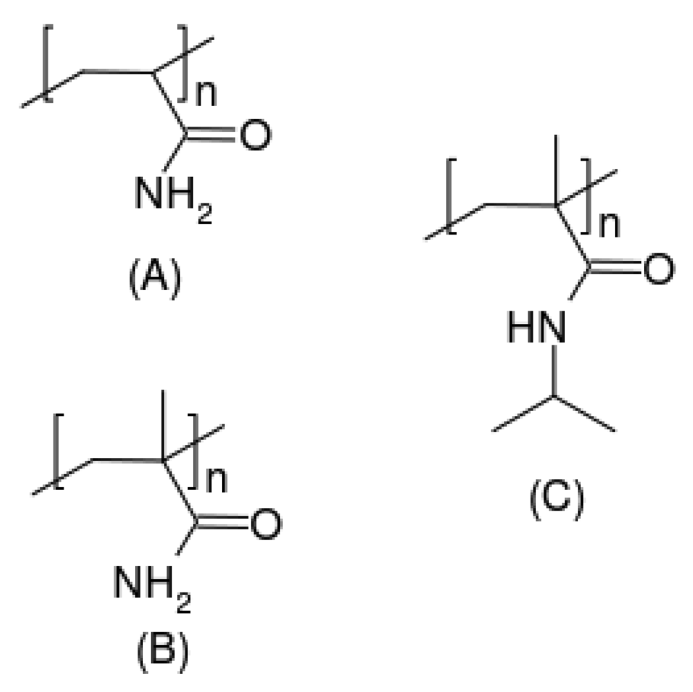 The polyacrylamide family is an amide derivative of poly(acrylic acid) (Figure 8). Polyacrylamide gels, because of their peptide/protein mimicking amide structure, are also candidates for cardiac tissue engineering. Similar to PEG hydrogels, crosslinking is needed to fabricate polyacrylamide hydrogels [7]. What makes polyacrylamide gel different from other gels mentioned above is its thermal sol-gel transition. Such a transition allows aqueous polyacrylamide solution to be liquid when the temperature is low; it then solidifies to form a gel at body temperature. The detailed mechanism of its thermosensitivity is still under debate. A widely accepted theory is that hydrogen bonds between amide groups and water molecules are dissociated and the pendant amide groups tend to collapse together as the temperature increases. Thus, the water molecules are repelled and a hydrophobic solid gel is formed [14]. Regardless of the mechanism, this thermosensitive property has been used to design novel injectable hydrogels that can be delivered in vivo in a liquid form through a needle and then turn into solid gels after contact with the warm tissue.