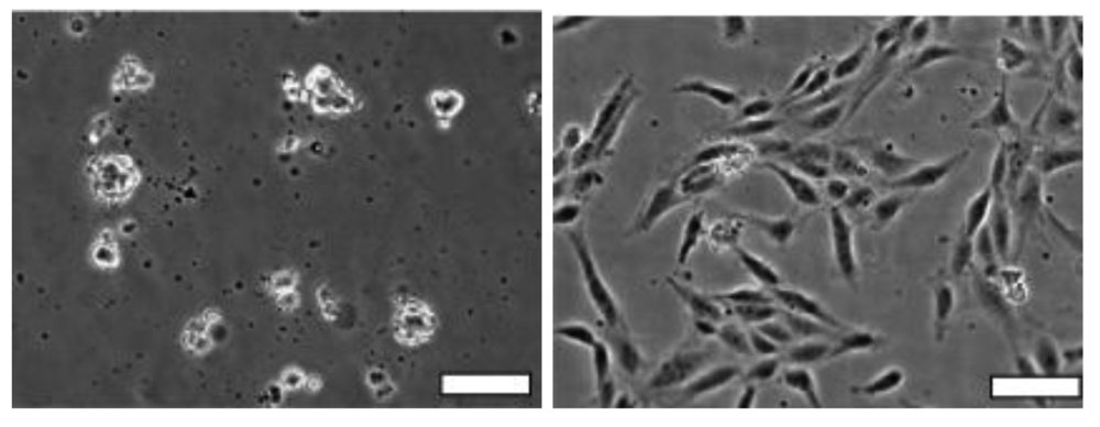 Introduction of naturally derived peptide sequences into synthetic hydrogels is another approach to fabricate natural/synthetic hydrogels. The peptide sequences can be cell adhesive motifs, enzyme-sensitive segments, and anti-inflammatory segments. RGD is a peptide sequence widely used to improve cell adhesion and biocompatibility [8,37,50-54]. The PEG gel containing RGD sequence has a significantly higher cell adhesion compared to the pure PEG gel [50] (Figure 9). The enzyme-sensitive peptides are used to adjust the degradation of the gel matrix to match the rate of the new ECM deposition during the tissue maturation. For example, a matrix metalloproteinase (MMP)-sensitive peptide was introduced to hyaluronic acid hydrogel and it was found that the gel had a faster degradation rate than the control (non-MMP-sensitive peptide incorporated gel) [52]. Kraehenbuehl et al. used a PEG gel that contains MMP-sensitive peptide to culture P19 embryonic stem cells, and found that MMP-mediated degradation facilitated stem cell differentiation into cardioprogenitor cells [7].