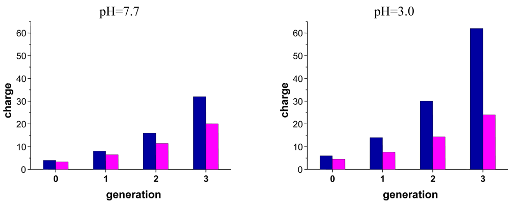 For example in generation 2 all amino groups are unprotonated at pH = 10.5. At pH = 7.7, all primary amino groups are protonated while the tertiary amino groups are nonprotonated resulting in a nominal charge of 16. At pH = 5.5, 55% of the tertiary amino groups are protonated resulting in a total nominal charge of 24 and at pH = 3 all amino groups are protonated resulting in the maximum nominal charge of 32.
