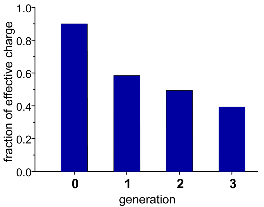 With increasing size (generation) of the dendrimer, there is an increasing deviation of the effective charge from the nominal charge. To illustrate that further, in Figure 5 the ratio between the effective and the nominal charge is shown. This ratio decreases from close to 1 for generation 0 down to 0.4 at higher generations. Counter ion condensation increases with the generation and thus with increasing nominal charge. Chen et al. [16] found in their investigations of PAMAM dendrimers depending on pH for generation 3 to 6 with SANS the similar trend. They found with increasing addition of DCl upon an amount equal to the full protonation of all primary amino groups of the dendrimer, a rising charge that hardly increased by further protonation. In the full protonated state of the dendrimers the counterion condensation increases with increasing generation, the fraction of the effective charge drops. Their result for generation G3 is in excellent agreement with our investigations. We observe a trend similar to the simulations in [15] for generation 1 to 3.
