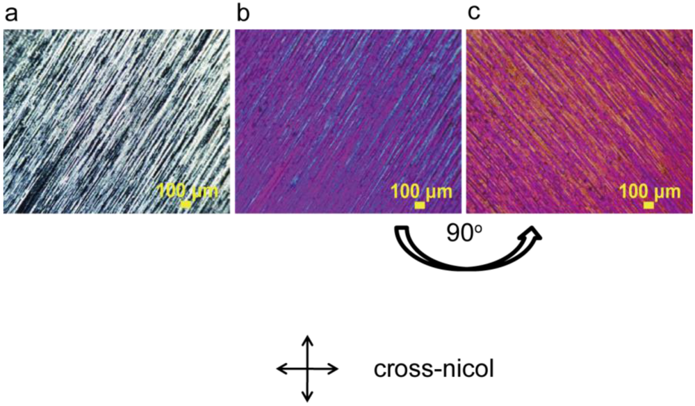 Figure 4(a–c) shows crossed-polarizing microscopic photos of Poly(3,4-BAHBA-co-4HCA) with a 4HCA composition of 75 mol%, taken under cross-nicol polarimetry at 250 °C, and the mechanical orientation of the sample was demonstrated by shearing [20,21]. Figure 4(a) shows crossed-polarizing microscopic images taken under cross-nicol, and in Figure 4(b,c) a first-order retardation plate (λ = 530 nm) was inserted into the light path. The birefringence was negative, as evidenced by both subtractive birefringence [blue color, Figure 4(b)] in the film running from the upper left to the lower right, and by additive birefringence [orange color, Figure 4(c)] in the shearing direction from the upper right to the lower left. The negative birefringence suggests that Poly(3,4-BAHBA-co-4HCA)s with a 4HCA composition of 75 mol% show an orientation of the polymer main-chains along the shear direction. Other samples of Poly(3,4-BAHBA-co-4HCA)s with the 4HCA compositions of 60 and 100 mol% also oriented by shearing. If one thermally prepared the liquid crystal state of the copolymer and then quenched it, the LC texture was retained, indicating that the liquid crystal can be fixed on a glass without crystallization.