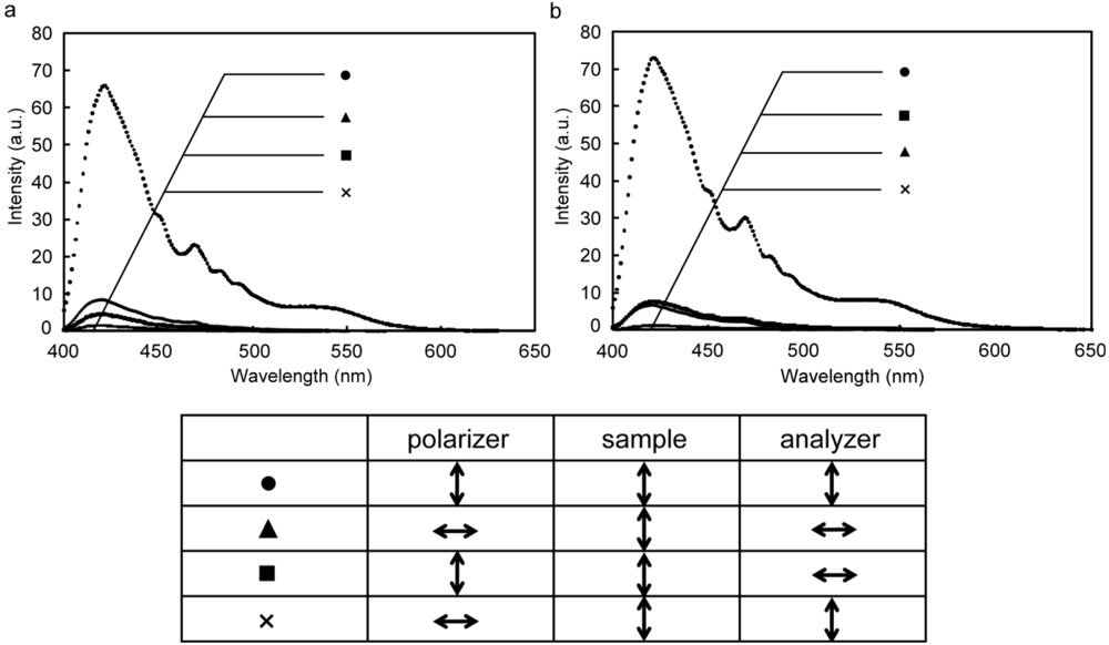 Figure 8 illustrates the optical train used for the photoluminescence dichroism measurements, which was performed using a fluorophotometer (FP-6500; Jasco Instruments Inc., Japan). The samples were mounted on a glass slide, and were heated by a Hot Stage. Just above the Tm, glass plates were used to sandwich the sample on the arrowed direction, and they were super-cooled to room temperature to create an oriented film coating the glass. We then inserted the film between the polarizer and the analyzer.