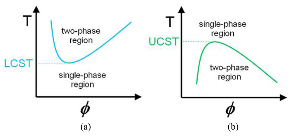 There are two main types of thermoresponsive polymers; the first present a lower critical solution temperature (LCST) while the second present an upper critical solution temperature (UCST). LCST and UCST are the respective critical temperature points below and above which the polymer and solvent are completely miscible as shown in Figure 1. Thus, for example, a polymer solution below the LCST is a clear, homogeneous solution while a polymer solution above the LCST appears cloudy (leading to LCST also being referred to as cloud point). This happens because it is energetically more favorable. In particular, considering the free energy of the system using the Gibbs equation ΔG = ΔH − TΔS (G: Gibbs free energy, H: enthalpy and S: entropy) the reason phase separation is more favorable when increasing the temperature is mostly due to the entropy of the system. Specifically, the main driving force is the entropy of the water, that when the polymer is not in solution the water is less ordered and has a higher entropy. This is also called the “hydrophobic effect” [11-13]. It is noteworthy that LCST is an entropically driven effect while UCST is an enthalpically driven effect [14].
