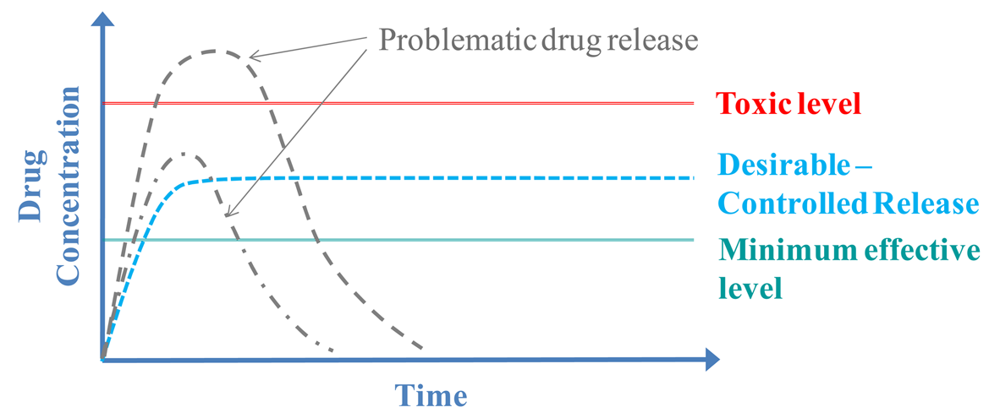 Nevertheless, even when using a carrier to deliver the drug it is difficult to have the desirable controlled release rate. Specifically, the delivery of a drug is often problematic because the concentration of the released drug at the target area is either too low or too high and is not delivered for the desirable amount of time, as shown with the gray dotted lines in the graph (Figure 2). Thus, the desirable-controlled drug release (shown with the blue line in the graph), that is often characteristic of a zero-order kinetic rate, is not easily achievable. Consequently “smart” polymeric carriers are used to deliver drugs. These carriers allow delivery of the drug at the right time and concentration by only releasing the drug in response to an external stimulus. For example the polymer chains of a carrier may expand as a result of the temperature increasing, thus enabling the drug to diffuse out and be released from the carrier [35]. Several studies aimed at controlled drug delivery using thermoresponsive polymer based carriers are discussed later in this review, categorized by their architecture/structural characteristics.