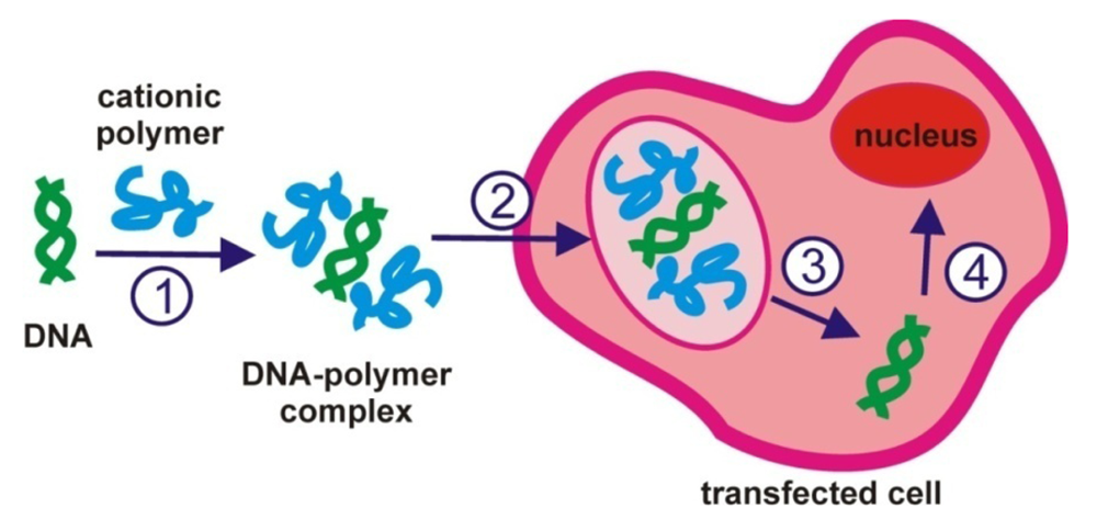 When using a polymeric carrier, the main steps of gene delivery (Figure 3), also called transfection, involve the: (1) DNA and polymer complexation; (2) addition of DNA/polymer complex (sometimes also called polyplex) onto cells for a period of time commonly called the transfection time; (3) removal of complex from the cells; (4) incubation time that is when the cells are left to incubate for a time period until results are observed. Complexation is usually performed at room temperature whilst the incubation and transfection periods are at 37 °C (body temperature that the cells need to be in order to survive). Interestingly, thermoresponsive polymers have been used to enhance the transfection efficiency by changing the temperature either during the complexation and/or during the incubation or transfection period. These studies are discussed below.