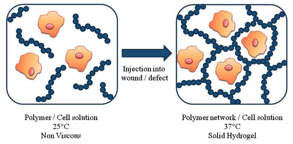 Thermoresponsive polymers in tissue engineering are commonly used in two situations: as substrates that enable the cell growth and proliferation and as injectable gels, for in situ of the scaffold. In the first application, the thermoresponsive ability of the polymers is used to regulate the cells' attachment and detachment from a surface [61-64]. In fact, in one study, the polymer surface was even reusable for repeated cell culture [65]. The second application involves the encapsulation of cells in a 3D structures in the body [19]. The in situ formation of cell/scaffold contrast compared to the in vitro formation of the construct allows the delivery of encapsulated cells, nutrients and growth factors to defects of any shape using minimally invasive techniques. The basic idea of the in situ formation is show in Figure 4. Specifically, the thermoresponsive polymer is mixed at room temperature with the cells and then injected into the body. Upon injection due to the temperature increase (to 37 °C) that is above the polymer's LCST, the polymer forms a physical gel. The cells are encapsulated within the 3D structure of the gel.