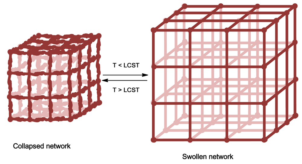 Hydrogels are polymer networks dispersed in water which form semi solid states containing upwards of 99% water w/w to polymer. These gels can be either covalently linked polymer networks or physical gels mentioned above. With reference to thermoresponsive polymers, covalently linked networks exhibit a change in their degree of swelling in response to temperature, Figure 5, whereas physical gels show a sol-gel transition [68].