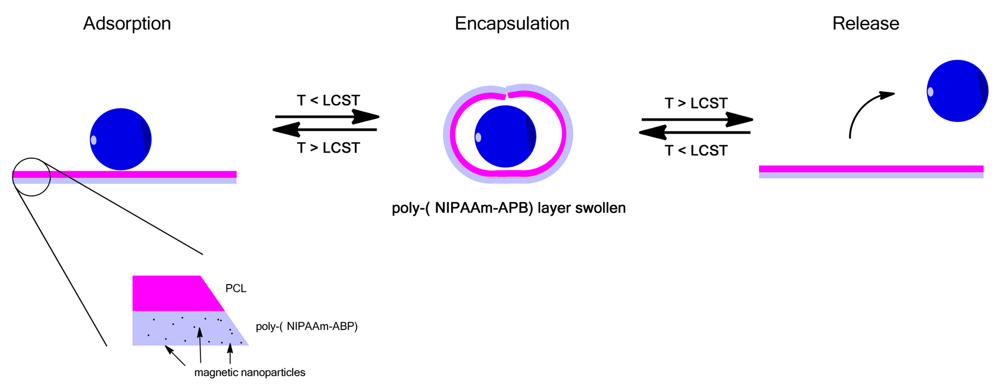 An interesting use of thermoresponsive polymer films was shown by Zakharchenko et al. where a bilayer of PVCL on top of PNIPAAm with encapsulated magnetic nanoparticles was prepared [128]. At temperatures greater than the LCST the films were flat and allowed for adsorption of nanoparticles, cells or drugs onto the surface, Figure 9, upon cooling the films rolled up entrapping the absorbed particles which could then be release by heating again [128]. This is a novel approach for the encapsulation and release of nanoparticles and cells with the addition of the magnetic particles allowing manipulation of the films by an external field [128].