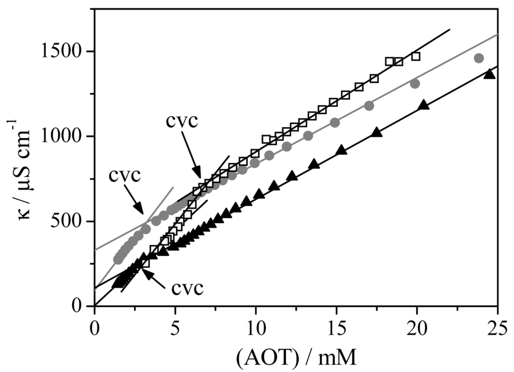 In previous works we used the 4-[6-methoxy-2-napthyl]-2-butanone, nabumetone, as fluorescent probe to obtain the critical vesicle concentrations of Aerosol OT vesicles [9,29]. Even though this probe has been successfully used to study different kinds of surfactant aggregation processes [9,29,44,45], it was not used in our systems because the PA and PMAO polymers present fluorescence emission. Therefore, we use electrical conductivity measurements to obtain the critical vesicle concentration.