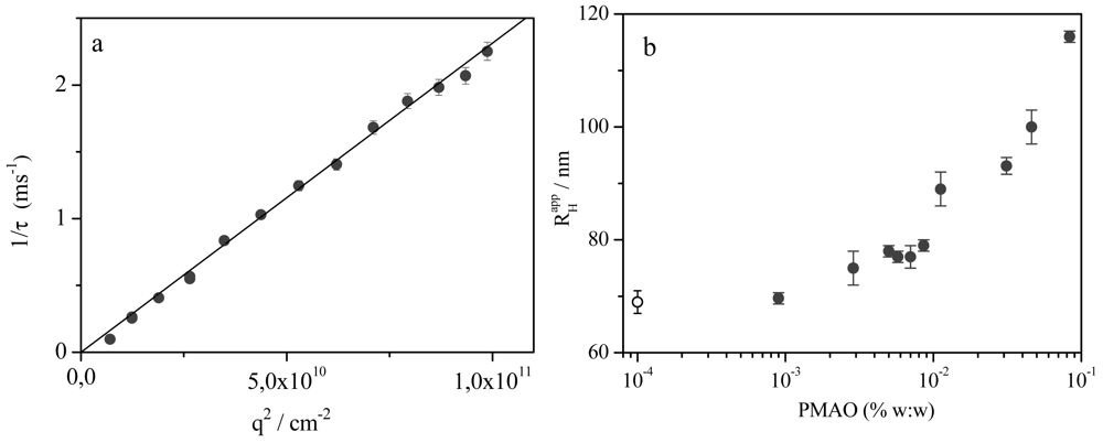 The correlation functions for AOT/PMAO systems are monomodal and the inverse time decay shows a linear dependence with q2, Figure 2(a). The apparent hydrodynamic radius was calculated from the apparent diffusion coefficient obtained from the slope of inverse time decay vs. q2 and the Stokes-Einstein equation. The apparent hydrodynamic radius is represented against the polymer concentration in the Figure 2(b). Examination of results in the Figure 2(b) shows that the hydrodynamic radius is almost independent of polymer concentration at low polymer concentrations with a size quite similar to the Aerosol OT vesicles. This fact seems to indicate that the incorporation of small concentrations of PMAO inside the vesicles bilayer does not affect the size of Aerosol OT vesicles. However, when the polymer concentration incorporates onto the bilayer is further increased the apparent hydrodynamic radius increases from 70 to 118 nm.