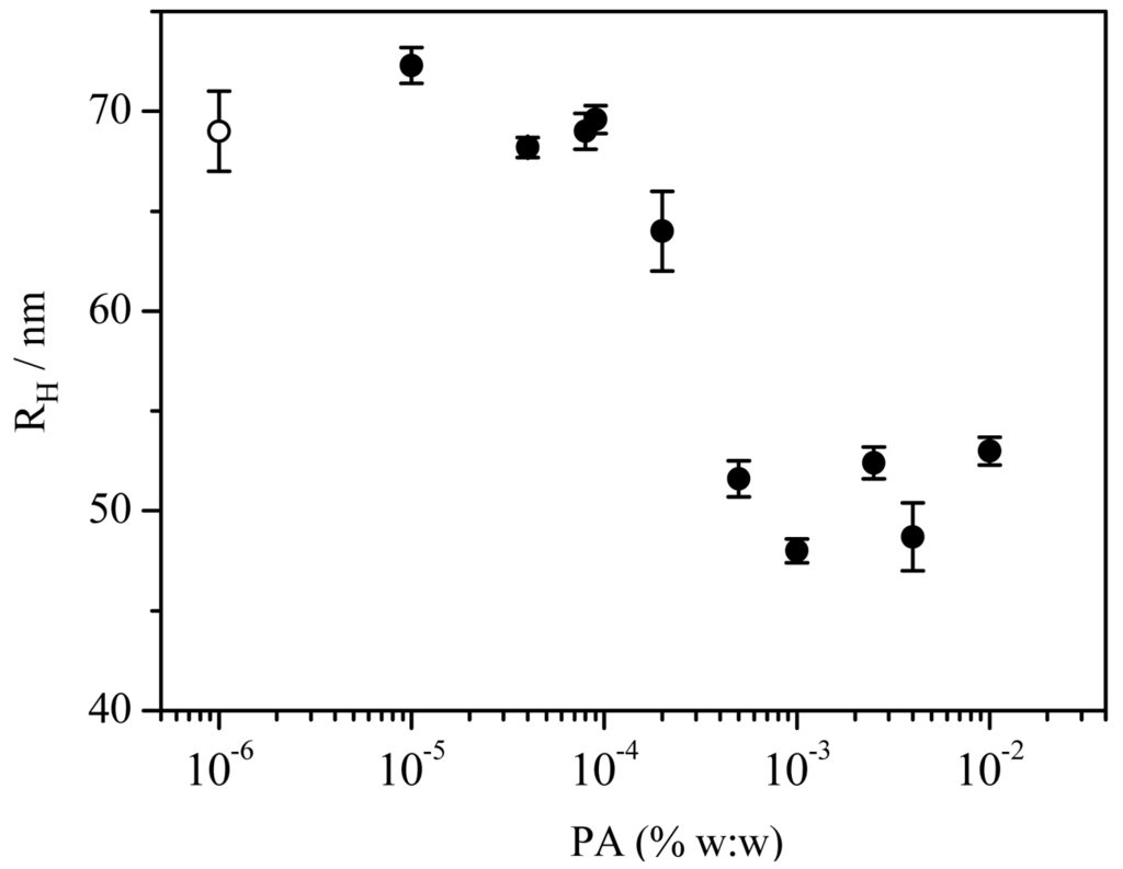 Examination of Figure 3 shows that for relatively small polymer concentrations, [PA] < 1 × 10−4% w:w, vesicles have the same size than the Aerosol OT ones and when PA concentration increases up to this value, the hydrodynamic radius decreases with PA concentration until it reaches a constant value of (50 ± 1) nm at the polymer concentration of 4 × 10−4%.