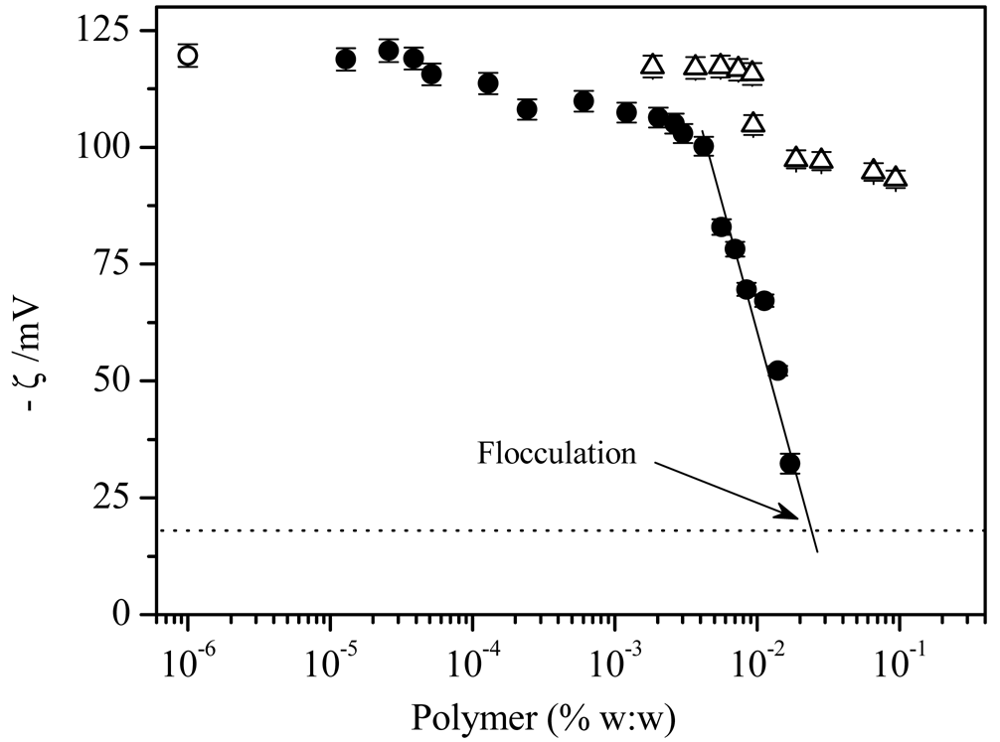 The electrophoretic mobility measurements were carried out by means of the laser Doppler electrophoresis technique using the Zetasizer 3000 device (Malvern, UK). All experiments were made in a 5 mm × 2 mm rectangular quartz capillary. Each experimental value is the average of ten measurements and the standard deviation of these measurements was considered the experimentalerror. The electrophoretic mobility values were also obtained at 30.0 °C. The electrophoretic mobility, μe, was converted into zeta-potential, ζ, using the Smoluchowski's relation, where η and ɛ are the viscosity and the permittivity of the solvent, respectively.