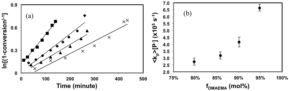 The apparent rate constant represented by the slopes of the kinetic plots, <kp>[P•], increased rapidly with the initial DMAEMA feed composition (fDMAEMA), especially when fDMAEMA ≥ 90 mol%, as shown in Figure 1(b). This result is expected as methacrylates have generally higher kp and much higher K (defined by Equation 6 when SG1 is the nitroxide) compared to styrene [,,].