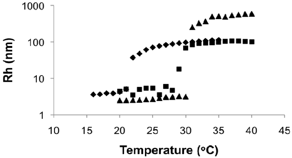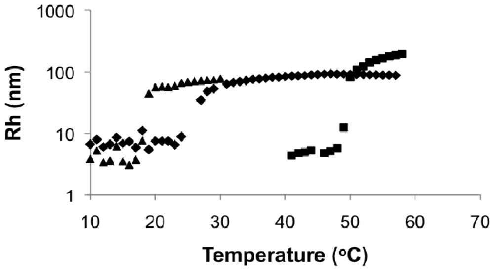 In the DLS measurements, Rh was below 10 nm at low temperature for all cases and rapidly rose up to about 500 nm for 0.3 and 0.5 wt% solutions and about 100 nm for 0.1 wt% solutions when the critical temperature was reached. It demonstrated the transformation of polymers from small, dispersed unimers [] to large aggregated particles upon heating. The shifts of critical temperature with concentration were similar to those observed by UV-Vis.