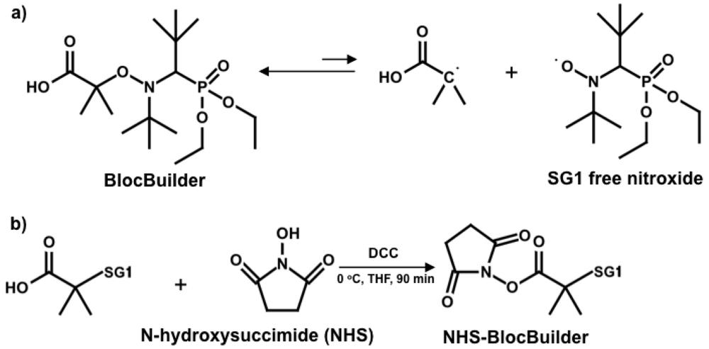 Besides controlling polymer microstructure, the alkoxyamine initiator fragment can permit functionalization and derivatization, such as using an initiator bearing an activated ester moiety. N-hydroxysuccinimidyl (NHS) esters readily react with nucleophiles in single-step reactions [] and precursors functionalized by NHS have been reported for ATRP [] and RAFT [] to yield α-functional polymers. Vinas et al. synthesized the first NHS-functionalized initiator for NMP using BlocBuilder []. The NHS-BlocBuilder (Scheme 1(b)) has been used to effectively control the homopolymerization of styrene and n-butyl acrylate, as well as statistical copolymerization of glycidyl methacrylate and styrene without aid of additional free SG1 nitroxide [,].