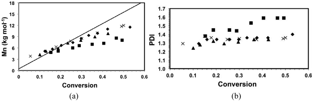 Linear molecular weight increase with conversion and narrow molecular weight distribution of the polymers are characteristics generally associated with controlled polymerizations. In Figure 2(a), number-average molecular weight (Mn) was plotted against conversion for the various copolymerizations. Mn increased linearly with conversion for all copolymerizations up to about 50% conversion. However, the slopes of the Mnversus conversion with different compositions varied and differed from the theoretical one as shown in Figure 2(a). For copolymerizations with fDMAEMA = 80–90 mol%, the slopes were very similar but slightly smaller than the theoretical predicted line. The small deviation in slopes can be attributed to the differences in hydrodynamic volumes of the copolymers and that of the poly(styrene) standards that used to calibrate the GPC. The copolymerization with fDMAEMA = 95 mol%, on the other hand, had a significantly flatter slope compared to the others, where the difference in hydrodynamic volumes cannot be the sole reason. The copolymerization with fDMAEMA = 95 mol% exhibited the most rapid kinetic behavior as shown in Figure 1. The fast kinetics was the result of not only higher <kp>, but also likely a comparatively higher <K> from the highly methacrylate-rich mixtures []. The latter point is particularly important for the level of control because high concentration of propagating radicals favors self-termination and the large K of methacrylates such as methyl methacrylate was claimed to be the main cause for its uncontrolled homopolymerization using nitroxides []. Such irreversible termination reactions can lower the overall Mn and lead to the decrease in slope, as was observed for the copolymerization with fDMAEMA = 95 mol% as observed in Figure 2(a).