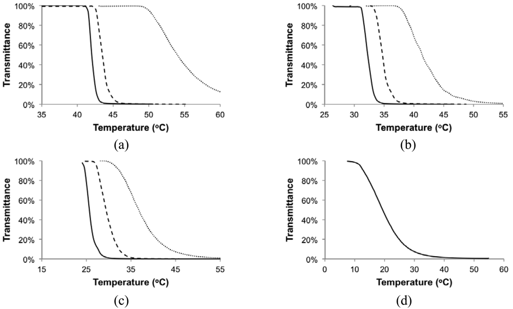 The light transmittance profiles reflected typical behavior of LCST-type phase separation, where solutions were 100% transparent at low temperature and became cloudy (0% transmittance) quickly above the critical temperature, illustrating the sudden solubility drop of the polymer in water. The transition temperature decreased as concentration increased. The shapes of the profiles were similar for different copolymers at the same concentration, where the transitions became broader as the concentration decreased from 0.5 wt% to 0.1 wt%.