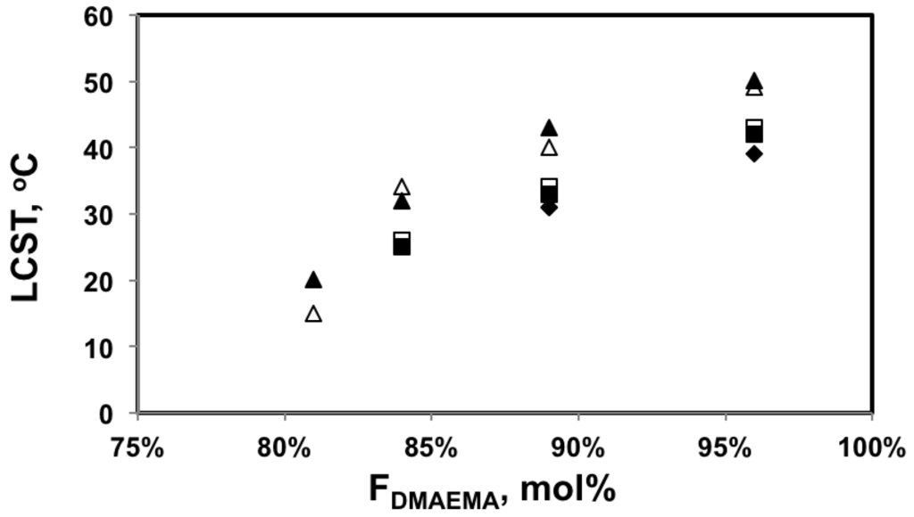 Indeed, the LCST of the statistical copolymers decreased with the higher styrene content in the copolymer as shown in Figure 7. The results from DLS and UV-Vis were very similar with the largest difference of 5 °C for the 0.1 wt% solution of the least soluble copolymer with 81 mol% DMAEMA (DMAEMA/S-80/20). Since the copolymer with 81 mol% DMAEMA was not soluble at 0.3 wt% concentration, 0.1 wt% was likely close to its saturation limit at the storage temperature (5 °C). As temperature increased, small amounts of polymer may precipitate before large aggregates could be formed due to a decreasing saturation concentration with temperature. This could introduce errors in its LCST measurements. For copolymers with 84 mol% or more DMAEMA, LCST changed linearly with composition and the slopes of the trends for different concentrations were very similar, which is consistent with the results of other studies [,,].