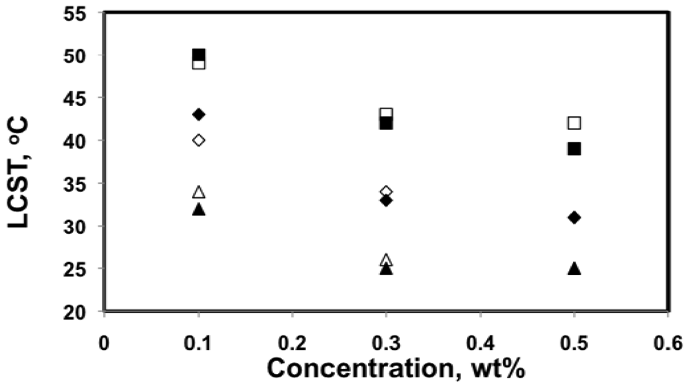 It was found that LCST in aqueous solutions was not very concentration-sensitive as long as the solution was not too dilute (typically above 1 wt%) [,,]. For dilute solutions, large amounts of water molecules are present in between each of the polymer chains, which can increase the energy needed to bring polymer chains together to form aggregates. This explains the broader transitions and smaller aggregate size for 0.1 wt% solutions shown in Figures 4 and 5. Because the transitions for 0.3 and 0.5 wt% solutions were very similar in terms of LCST, sharpness of the transition and the size of the aggregates, 0.5 wt% is likely close to the critical concentration, above which LCST is no longer sensitive to concentration.