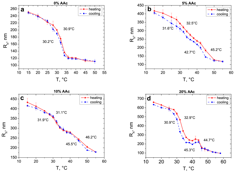 For all types of microgels the thermo-induced swelling and shrinking are completely reversible and a slight shift in the LCST takes place in cooling and heating processes (Table 2). As it was expected, the hydrodynamic radius increases with increasing AAc content because of the increasing electrostatic repulsion between the polymer chains and an increase in the osmotic pressure.
