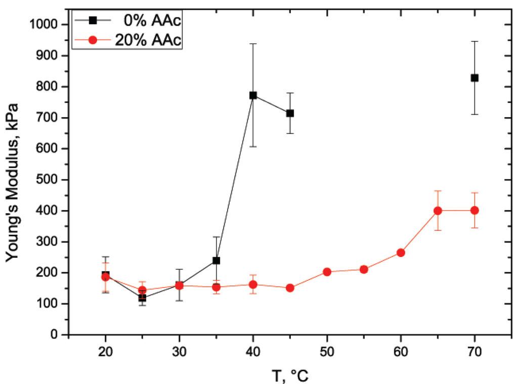 Figure 10 shows the temperature dependence of the Young's modulus of the microgels synthesised with 0% (squares) and 20% (circles) AAc at the centre of the particle (square no. 5 corresponding to Figure 8). At low temperatures the stiffness of both microgels is equal and confirm the previous elasticity measurements on PNIPAM films [28]. The periphery morphology for both microgels should be equal resulting in the same Young's modulus. With increasing temperature, the stiffness of both pure PNIPAM and PNIPAM-co-AAc particles increases, due to the shrinking process dominated by hydrophobic interactions. While the stiffness of the microgel synthesised with 20% AAc slightly enhanced, PNIPAM particles without co-monomer end up with a higher Young's modulus. It should be noted that in elasticity measurements, the LCST of the microgel containing 20% AAc shifts to higher temperature compared to the one obtained by SFM and DLS measurements. The transition temperature shifts by about 10 °C from 45 °C (SFM cross section) to 55 °C (Young's modulus). In the case of pure PNIPAM particles, a slight LCST shift takes place from 31 °C to 36 °C. These results are consistent with a core-shell model introduced by Daly and Saunders [29]. They developed a model with a stepwise collapse of the polymer network. At first, the higher cross-linked core collapses. By further heating the shell expels water, resulting in a more pronounced shrinking. Force measurements confirm this core-shell model by Daly and Saunders. At low temperature the AFM tip penetrates the lower cross-linked shell. Due to the hydration of the polymer network, the microgel is extended leading to a low Young's modulus. With the increase in temperature, the core starts the shrinking process, while the shell keeps its original size. This leads to a constant Young's modulus as the AFM tip still measures the elasticity of the lower cross-linked shell. Further heating leads to the shell collapse resulting in a tremendous increase in the measured stiffness of the PNIPAM particles and a less pronounced increase for PNIPAM-co-AAc. The Young's modulus and size stay constant after the shell collapse.