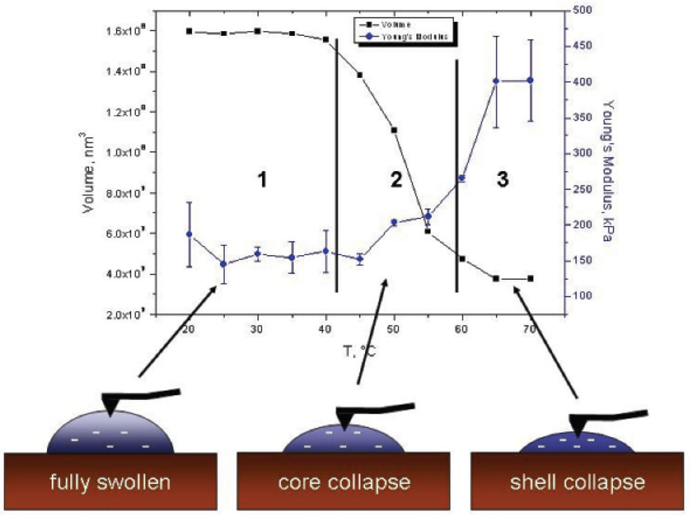 This model also explains the LCST shift for both PNIPAM and PNIPAM-co-AAc microgels, shown in Figure 11. The higher Young's modulus and the slightly larger LCST value of the pure PNIPAM gels compared to the gels containing AAc suggests a less pronounced core-shell structure in the former. Due to the disappearance of the co-monomer in the case of pure PNIPAM, a “smaller” shell is formed during the synthesis, which results in a less pronounced core-shell structure. On the other hand, the incorporation of the co-monomer causes an increase in both the diffuse shell and the mesh size, which results in a softer microgel at high temperatures and a more expressed core-shell structure of those particles. The soft behaviour of PNIPAM-co-AAc particles also results from a high water content in the polymer network even at temperatures above the LCST. Schmidt et al. showed just a slight shift in the refractive index from 1.34 (below LCST) to 1.37 (above LCST) [13]. Neutron experiments confirm a water content up to 90% in such gels [30]. The core-shell structure becomes even more pronounced by the fact that the charges are expelled towards the shell of the particles [17,19]. Zeta potential measurements show that most of the functional groups are located in the particle periphery [12]. With the collapse of the polymer network, the charge density increases in the shell, resulting in a softening of the particle.