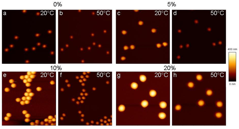 In order to investigate the swelling/deswelling behaviour of adsorbed PNIPAM microgels, SFM measurements were performed in a temperature controlled liquid cell. Figure 2 shows the SFM images of all four types of microgel particles deposited on Au-coated Si-wafers at 20 °C (swollen state) 50 °C (collapsed state). The particle size increases with increasing the amount of co-monomer as already discussed for the bulk. It should be noted that the particle pattern does not change during the heating process and no particle desorption takes place.