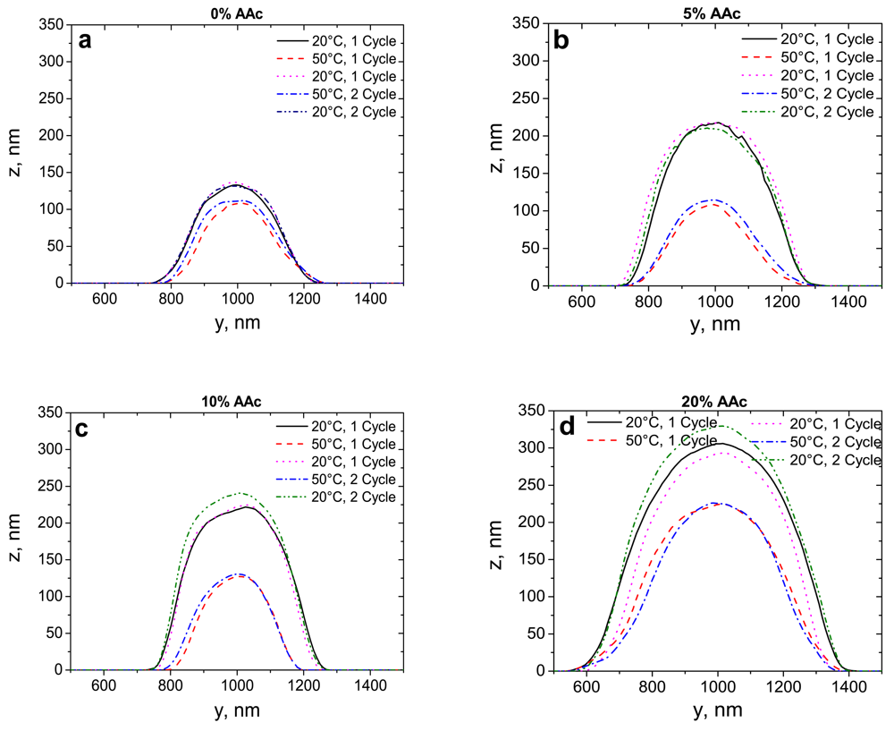 In order to compare the behaviour of deposited microgels, the cross sections of particles, which were obtained from the particles in Figure 2, with 0%, 5%, 10% and 20% AAc in the swollen (20 °C) and collapsed states (50 °C) in two short cycles are presented in Figure 3. All adsorbed microgels demonstrate a reversible thermo-induced swelling/shrinking behaviour. The size change of adsorbed microgels mainly takes place in a vertical direction.
