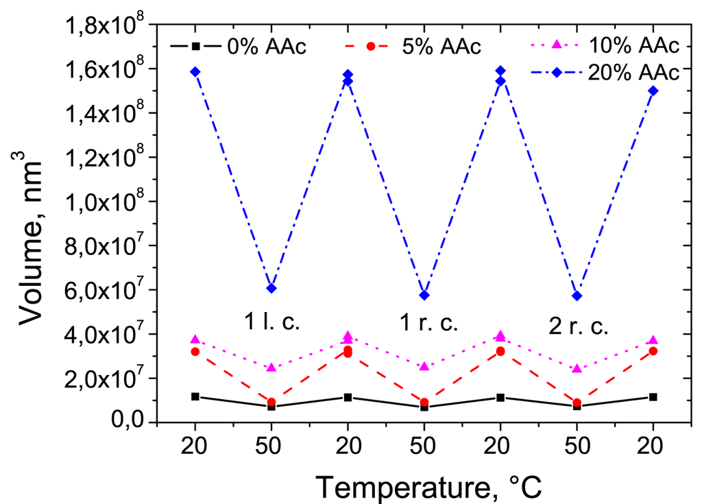 In context of the reversibility of the swelling behaviour, the reswelling of the particles was studied after a complete drying. In Figure 6 the volume of deposited microgels in the swollen and in the collapsed state in long cycle (l.c.) and in two reswelling cycles (r.c.) is presented. Reswelling cycles demonstrate the thermo-induced behaviour of adsorbed particles after the complete drying. The microgels still exhibit sensitivity to temperature changes and show reversible swelling/deswelling behaviour. The reswollen microgels maintain the same volume values as before drying.
